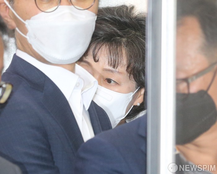 [서울=뉴스핌] 황준선 기자 = 만5세 초등 취학 정책으로 논란을 빚었던 박순애 사회부총리 겸 교육부 장관이 8일 오후 서울 여의도 한국교육시설안전원에서 사퇴 기자회견을 마치고 엘레베이터에 탑승하고 있다. 2022.08.08 hwang@newspim.com