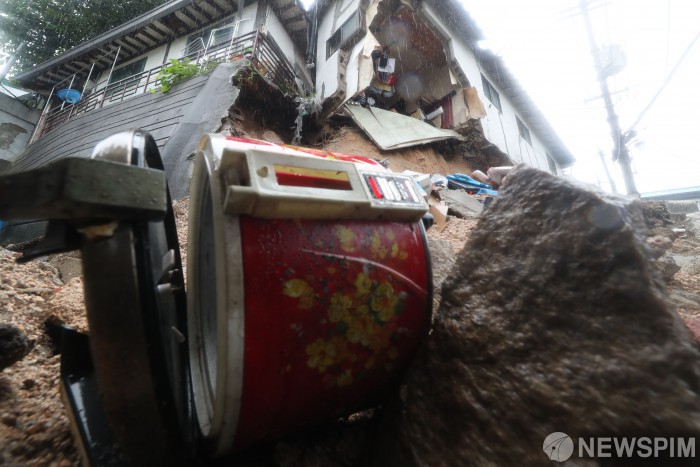 [서울=뉴스핌] 김학선 기자 = 지난 8일 서울 기상 관측이 시작된 지 115년 만에 가장 많은 양의 비가 갑자기 한번에 쏟아져 서울 종로구 사직동의 한 주택가 축대가 무너졌다. 이 사고로 인근 주민 3가구 5명이 대피했다. 사진은 9일 축대가 무너진 주택가의 모습. 2022.08.09 yooksa@newspim.com