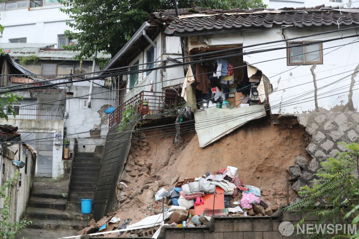 [서울=뉴스핌] 김학선 기자 = 지난 8일 서울 기상 관측이 시작된 지 115년 만에 가장 많은 양의 비가 갑자기 한번에 쏟아져 서울 종로구 사직동의 한 주택가 축대가 무너졌다. 이 사고로 인근 주민 3가구 5명이 대피했다. 사진은 9일 축대가 무너진 주택가의 모습. 2022.08.09 yooksa@newspim.com
