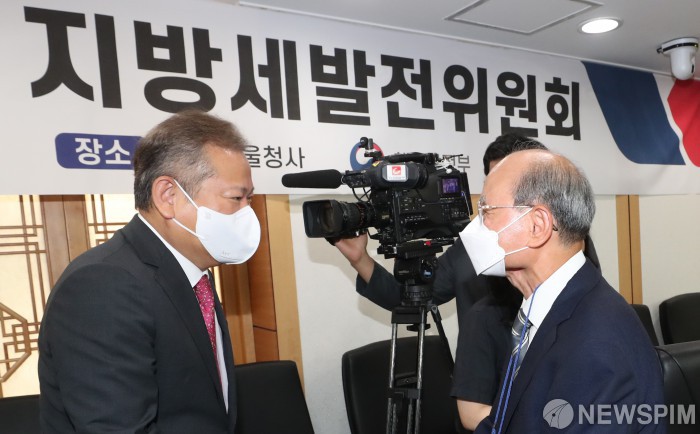 [서울=뉴스핌] 김학선 기자 = 이상민 행정안전부 장관이 11일 오후 서울 종로구 정부서울청사에서 열린 지방세발전위원회에서 참석자들과 인사하고 있다. 이날 위원회는 지방세와 관련된 주요 현안과 2022년 지방세입 제도개선 과제에 대해 각계 전문가들의 의견을 수렴하기 위해 열렸다. 2022.08.11 yooksa@newspim.com