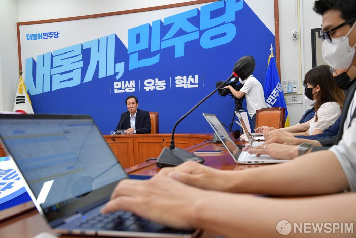 [서울=뉴스핌] 최상수 기자 = 코로나19 확진 후 자택 격리를 마친 우상호 더불어민주당 비상대책위원장이 11일 오후 서울 여의도 국회에서 기자간담회를 갖고 있다. (공동취재사진) 2022.08.11 photo@newspim.com