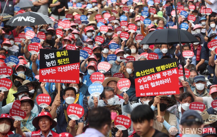 [서울=뉴스핌] 김민지 기자 = 전국한우협회와 대한한돈협회, 한국낙농육우협회 등 9개 축산생산자단체가 11일 오후 서울역 인근에서 총궐기대회를 열고 수입 축산물 무관세 철회와 사료값 상승 대책 마련을 촉구하고 있다. 2022.08.11 kimkim@newspim.com