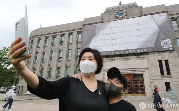 [서울=뉴스핌] 김학선 기자 = 광복절인 15일 서울 중구 서울도서관 '꿈새김판'에 광복절 노래 악보가 걸려 있다. 광복 77주년을 맞이해 걸린 이 현수막에는 광복절 노래를 직접 연결할 수 있는 QR코드가 적혀 있다. 2022.08.15 yooksa@newspim.com