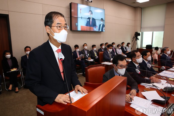 [서울=뉴스핌] 최상수 기자 = 17일 국회 산업통상자원위원회 전체회의실에서 열린 '2030 부산세계박람회 유치지원 특별위원회'에서 한덕수 공동위원장이 업무보고를 하고 있다. (공동취재사진) 2022.08.17 photo@newspim.com