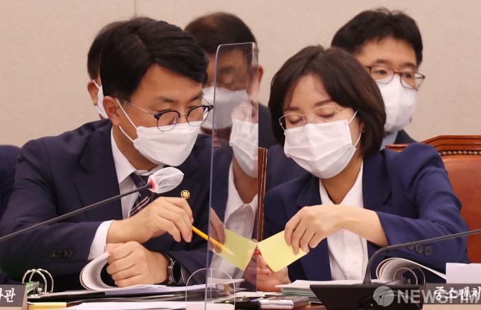[서울=뉴스핌] 최상수 기자 = 이영 중소벤처기업부 장관(오른쪽)과 조주현 중소벤처기업부 차관이 22일 오후 서울 여의도 국회에서 열린 산업통상자원중소벤처기업위원회 전체회의에 참석해 메모지를 보며 귀엣말을 하고 있다. (공동취재사진) 2022.08.22 photo@newspim.com