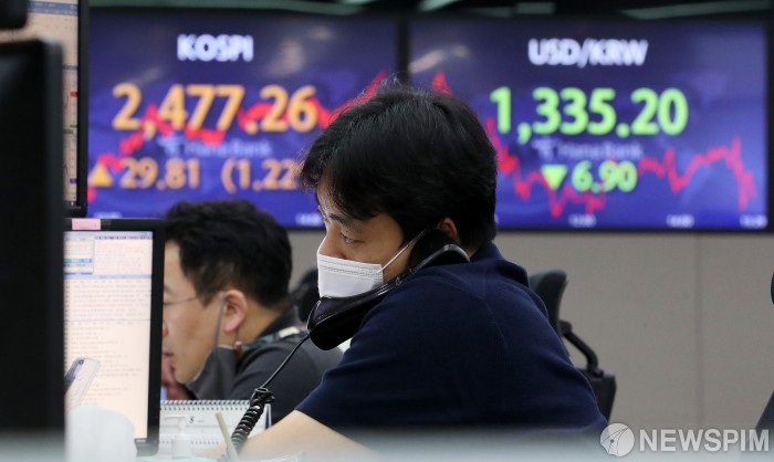[서울=뉴스핌] 정일구 기자 = 25일 코스피 지수가 전 거래일보다 29.81포인트(1.22%) 상승한 2477.26에 마감했다. 코스닥 지수는 14.23포인트(1.79%) 오른 807.37에 종료했다. 원·달러 환율은 전 거래일보다 6.9원 내린 1335.2원에 장을 마쳤다. 이날 오후 서울 중구 하나은행 딜링룸에서 딜러들이 업무를 보고 있다. 2022.08.25 mironj19@newspim.com