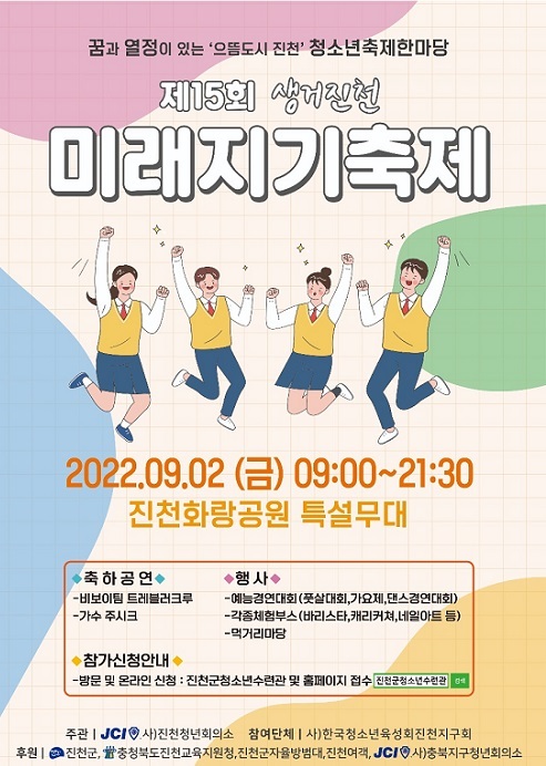 [진천=뉴스핌] 백운학 기자 =충북 진천군은 오는 9월 2일 진천읍 화랑공원 일원에서 진천 관내 청소년들을 대상으로 청소년 축제 한마당 제15회 생거진천 미래지기축제를 개최한다고 26일 밝혔다.