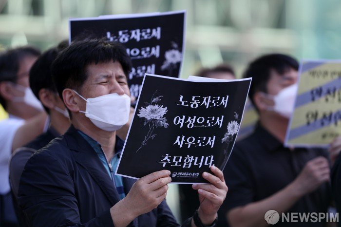 [서울=뉴스핌] 정일구 기자 = 서울교통공사노동조합 관계자들이 20일 오전 서울 중구 서울시청 앞에서 신당역 사고 피해자를 추모하고 재발방지 및 안전대책 수립을 촉구하는 기자회견을 하고 있다. 2022.09.20 mironj19@newspim.com