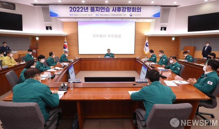 [서울=뉴스핌] 김학선 기자 = 한덕수 국무총리가 23일 서울 종로구 정부서울청사 별관에서 열린 을지연습 사후강평회의를 주재하고 있다. 2022.09.23 yooksa@newspim.com