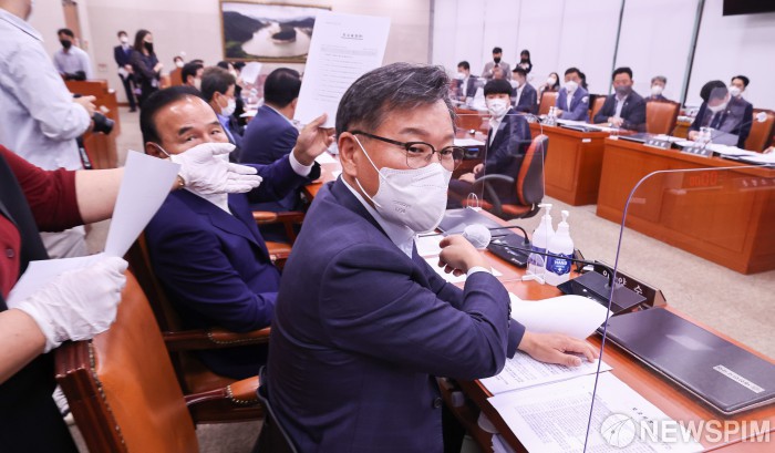 [서울=뉴스핌] 최상수 기자 = 26일 서울 여의도 국회에서 열린 농림축산식품해양수산위원회 전체회의에서 이양수 국민의힘 간사가 양곡관리법 일부개정법률안과 관련해 여야 합의가 되어있지 않은 것에 대해 항의를 하며 의사일정안을 수거해 갈 것을 요청하고 있다. 2022.09.26 kilroy023@newspim.com