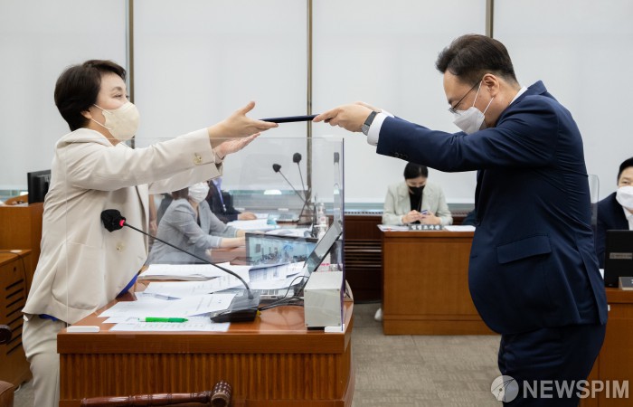 [서울=뉴스핌] 최상수 기자 = 조규홍 보건복지부 장관 후보자가 27일 오후 서울 여의도 국회에서 열린 보건복지위원회의 인사청문회에서 선서를 마친 후 정춘숙 위원장에게 선서문을 제출하고 있다. (공동취재사진) 2022.09.27 photo@newspim.com