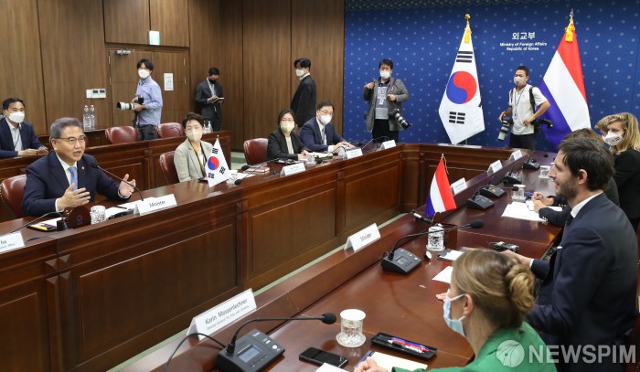 [서울=뉴스핌] 김학선 기자 = 박진 외교부 장관과 웝크 훅스트라 네덜란드 외교장관이 28일 서울 종로구 외교부 청사에서 한-네덜란드 외교장관회담을 하고 있다. 2022.09.28 yooksa@newspim.com