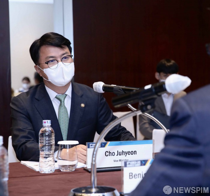 [서울=뉴스핌] 조주현 중소벤처기업부 차관이 30일 서울시 용산구 그랜드하얏트 서울에서 베닝뇨 로페즈 베니테스(Benigno López Benítez) 미주개발은행(IDB) 부총재와 양자면담을 하고 있다. [사진=중소벤처기업부] 2022.09.30 photo@newspim.com