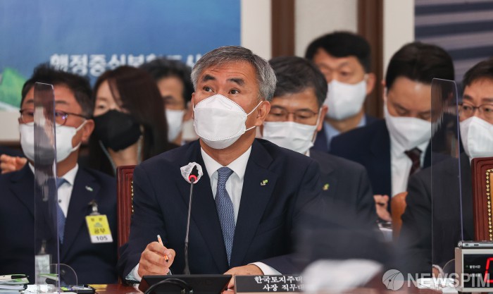 [서울=뉴스핌] 최상수 기자 = 이정관 한국토지주택공사 사장직무대행이 4일 서울 여의도 국회에서 열린 국토교통위원회의 한국토지주택공사, 국토안전관리원, 주택관리공단, 건설기술교육원에 대한 국정감사에서 생각에 잠겨 있다. 2022.10.04 kilroy023@newspim.com