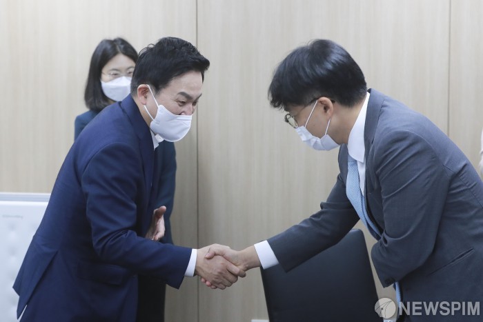 [서울=뉴스핌] 이형석 기자 = 원희룡 국토교통부 장관이 4일 오후 서울 여의도 HUG 서부주택도시금융센터에서 열린 관리비 투명화 및 사각지대 해소를 위한 간담회에서 참석자들과 악수를 하고 있다. 2022.10.04 leehs@newspim.com