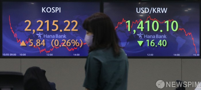 [서울=뉴스핌] 황준선 기자 = 5일 코스피는 전 거래일(2209.38)보다 5.84포인트(0.26%) 오른 2215.22에 장을 닫았다. 코스닥지수는 전 거래일(696.79)보다 11.45포인트(1.64%) 내린 685.34에 거래를 종료했다. 원·달러 환율은 전 거래일(1426.5원)보다 16.4원 하락한 1410.1원에 마감했다. 이날 오후 서울 중구 하나은행 딜링룸 전광판에 지수가 표시돼 있다. 2022.10.05 hwang@newspim.com