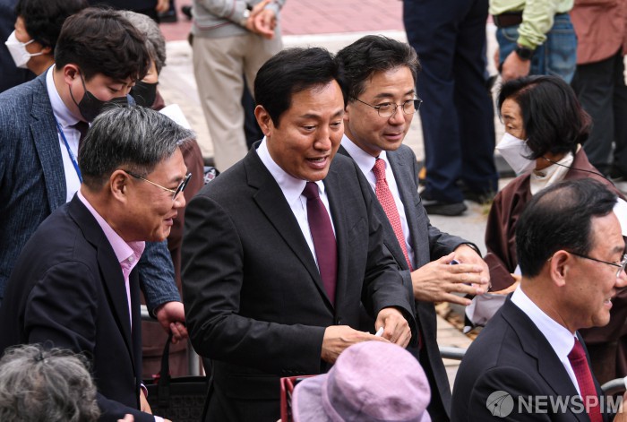 [서울=뉴스핌] 국회사진취재단 = 오세훈 서울시장이 5일 오후 서울 종로구 조계사 대웅전 앞에서 열린 대한불교조계종 제37대 총무원장 진우스님 취임법회에 참석하고 있다. 2022.10.05 photo@newspim.com