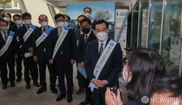 [서울=뉴스핌] 최상수 기자 = 이창양 산업통상자원부 장관이 6일 서울 마포구 서울에너지드림센터에서 열린 공공기관 에너지 다이어트 결의식을 마친 뒤 서울에너지드림센터를 둘러보고 있다. 2022.10.06 kilroy023@newspim.com