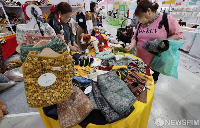 [서울=뉴스핌] 김민지 기자 = 14일 오후 서울 서초구 양재동 aT센터에서 열린 제32회 코리아펫쇼에서 견주와 강아지가 부스를 둘러보고 있다. 이번 박람회는 16일까지 열린다. 2022.10.14 kimkim@newspim.com