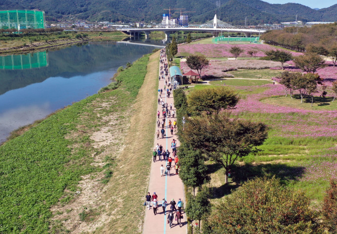 | 지난 15일 밀양시 삼문동 밀양강변 일원에서 '공기의 날 기념 제4회 맑은공기 걷기대회'가 열리고 있다.[사진=밀양시] 2022.10.16 |