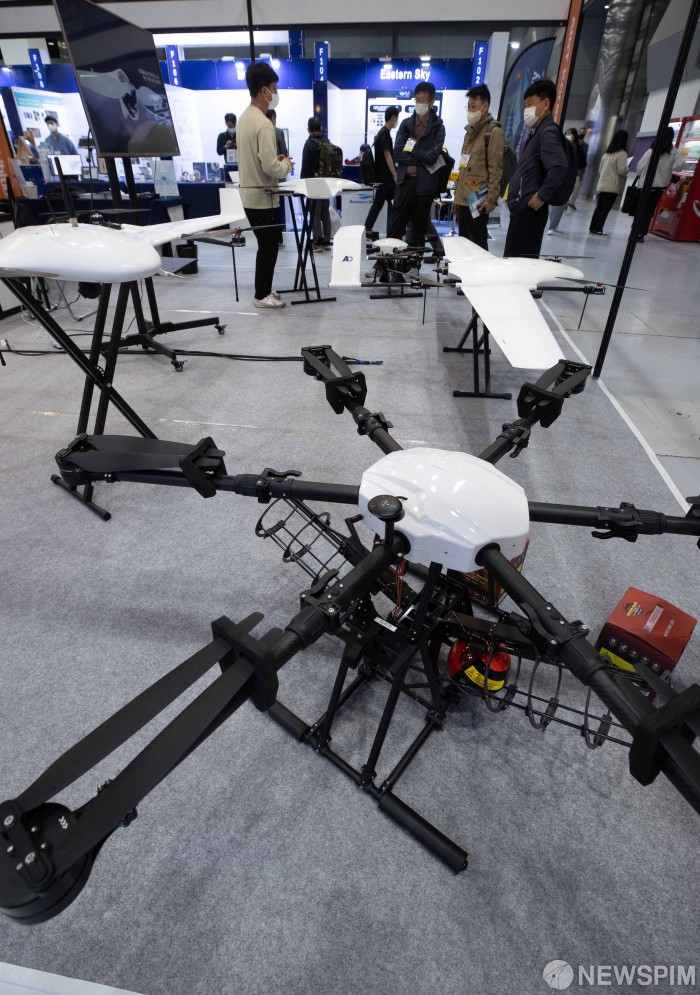 [서울=뉴스핌] 윤창빈 기자 = 19일 오전 서울 강남구 코엑스에서 열린 AIoT 국제전시회를 찾은 관람객들이 인공지능 무인이동체를 둘러보고 있다. 2022.10.19 pangbin@newspim.com