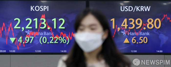 [서울=뉴스핌] 정일구 기자 = 21일 코스피 지수가 전 거래일보다 4.97포인트(0.22%) 내린 2213.12에 마감했다. 코스닥 지수는 전 거래일보다 5.96포인트(0.88%) 하락한 674.48에 종료했다. 원·달러 환율은 전 거래일보다 6.5원 오른 1439.8원에 장을 마쳤다. 이날 오후 서울 중구 하나은행 딜링룸에서 딜러들이 업무를 보고 있다. 2022.10.21 mironj19@newspim.com