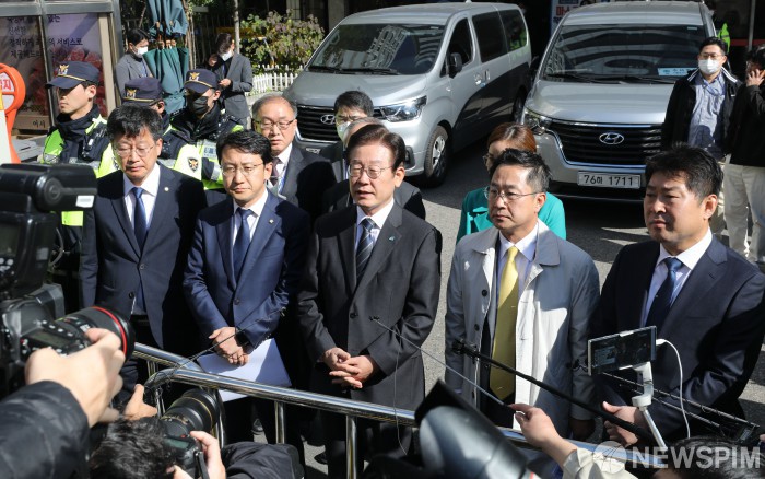 [서울=뉴스핌] 황준선 기자 = 이재명 더불어민주당 대표가 24일 오전 검찰 압수수색이 진행중인 서울 여의도 더불어민주당 당사 앞에서 입장을 밝히고 있다. 2022.10.24 hwang@newspim.com
