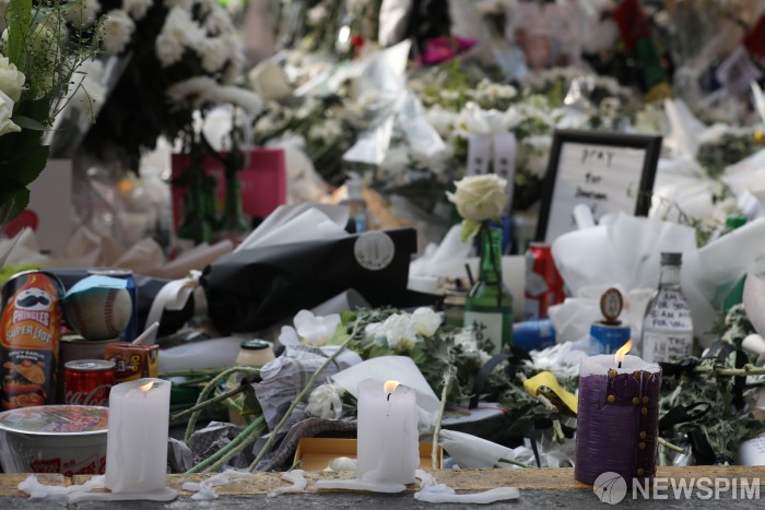 [서울=뉴스핌] 황준선 기자 = 이태원 참사 엿새째인 3일 오전 서울 용산구 이태원역 1번 출구 앞에 마련된 희생자 추모공간에 양초가 놓여 있다. 2022.11.03 hwang@newspim.com