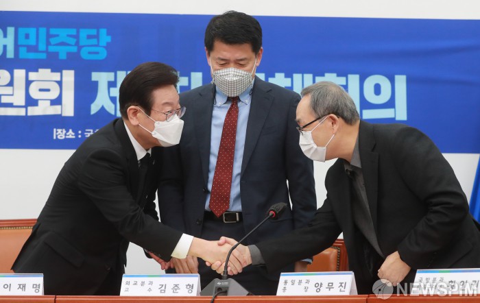 [서울=뉴스핌] 이형석 기자 = 이재명 더불어민주당 대표가 4일 오전 서울 여의도 국회에서 열린 평화·안보 대책위원회 제1차 전체회의에서 양무진 통일분과 총장과 악수를 하고 있다. 2022.11.04 leehs@newspim.com
