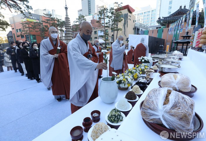 [서울=뉴스핌] 황준선 기자 = 4일 오후 서울 종로구 조계사에서 열린 이태원 참사 희생영가 추모 위령법회에서 스님들이 희생자들을 추모하고 있다. 2022.11.04 hwang@newspim.com