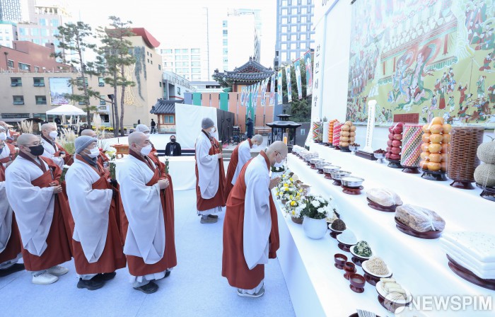 [서울=뉴스핌] 황준선 기자 = 4일 오후 서울 종로구 조계사에서 열린 이태원 참사 희생영가 추모 위령법회에서 스님들이 희생자들을 추모하고 있다. 2022.11.04 hwang@newspim.com