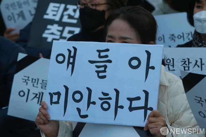 [서울=뉴스핌] 이형석 기자 = 5일 오후 서울 중구 시청역 인근에서 열린 이태원 참사 희생자 추모 시민 촛불 집회에서 시민들이 피켓을 들고 있다. 2022.11.05 leehs@newspim.com