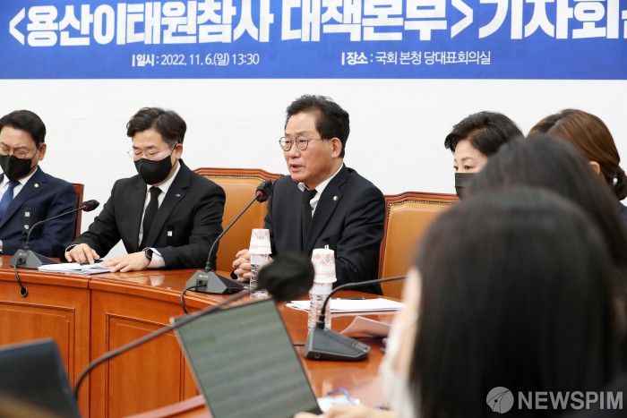 [서울=뉴스핌] 정일구 기자 = 유기홍 더불어민주당 용산이태원참사 대책본부 국민추모단장이 6일 오후 서울 여의도 국회에서 열린 용산이태원참사 대책본부 기자회견에서 발언을 하고 있다. 2022.11.06 mironj19@newspim.com