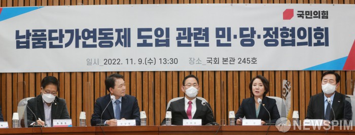 [서울=뉴스핌] 이형석 기자 = 이영 중소벤처기업부 장관이 9일 오후 서울 여의도 국회에서 열린 납품단가 연동제 도입 관련 민당정협의회에서 모두발언을 하고 있다. 2022.11.09 leehs@newspim.com