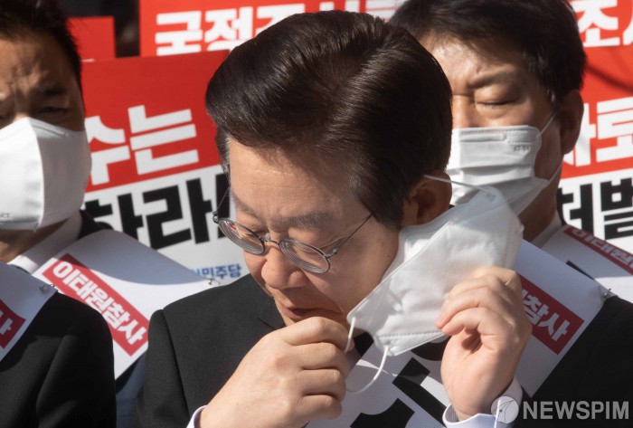 [서울=뉴스핌] 윤창빈 기자 = 이재명 더불어민주당 대표가 11일 오후 서울 여의도역 인근에서 열린 이태원참사 국정조사⋅특검 추진 범국민 서명운동 발대식에서 마스크를 벗고 있다. 2022.11.11 pangin@newspim.com