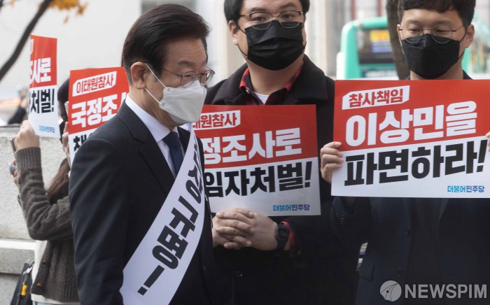 [서울=뉴스핌] 윤창빈 기자 = 이재명 더불어민주당 대표가 11일 오후 서울 여의도역 인근에서 열린 이태원참사 국정조사⋅특검 추진 범국민 서명운동 발대식에 참석하고 있다. 2022.11.11 pangin@newspim.com