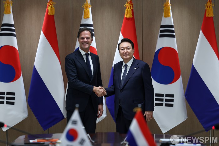 [서울=뉴스핌] 윤석열 대통령이 17일 용산 대통령실 청사에서 열린 한-네덜란드 정상회담에서 마크 루터 네덜란드 총리와 기념촬영을 하고 있다. [사진=대통령실] 2022.11.17 photo@newspim.com