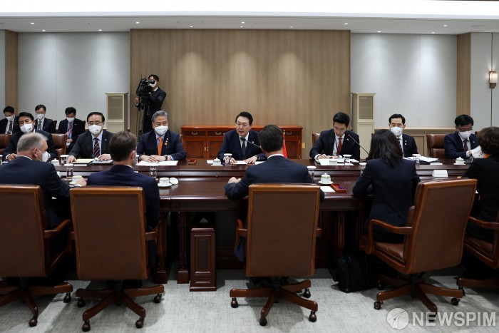 [서울=뉴스핌] 윤석열 대통령이 17일 용산 대통령실 청사에서 마크 루터 네덜란드 총리와 정상회담을 하고 있다. [사진=대통령실] 2022.11.17 photo@newspim.com