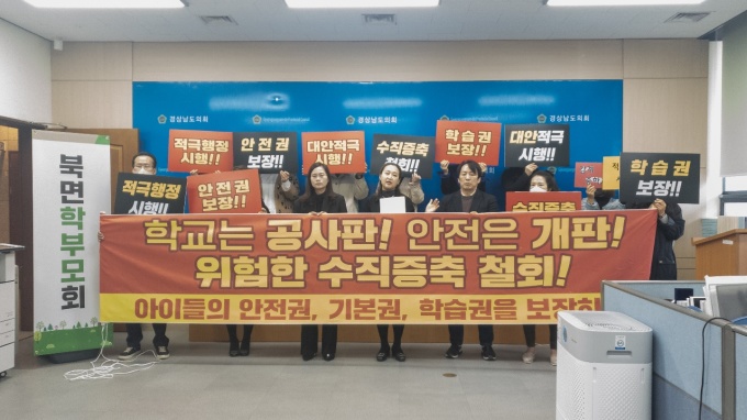북면학부모회는 "공사기간을 앞으로 당길 수 있으며 감계2중학교 조기신설해 25년으로 당겨 주실 것을 강력하게 요구한다"면서 "교육청은 아이들의 안전을 위협하는 증축 행정을 당장 철허하라"고 거득 촉구했다.
