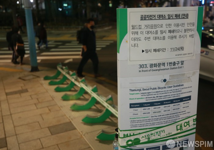 [서울=뉴스핌] 이형석 기자 = 월드컵 축구 대표팀과 우루과이의 첫 경기를 앞두고 거리응원이 준비되는 24일 오후 서울 종로구 광화문 인근의 따릉이 대여소가 시민들의 안전을 위해 임시 폐쇄되어 있다. 2022.11.24 leehs@newspim.com