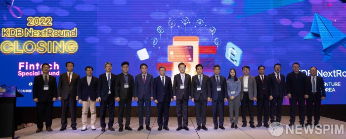 [서울=뉴스핌] 윤창빈 기자 = 김주현 금융위원회 위원장, 강석훈 KDB산업은행 회장 등 참석자들이 7일 오전 서울 여의도 글래드 호텔에서 열린 2022 KDB 넥스트라운드 : 핀테크 스페셜 라운드에서 기념촬영을 하고 있다. 2022.12.07 pangbin@newspim.com