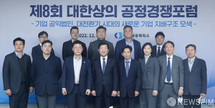 [서울=뉴스핌] 우태희 대한상의 상근부회장(앞줄 왼쪽 네번째)이 8일 오전 서울 세종대로 대한상의회관에서 열린 제8회 대한상의 공정경쟁포럼에서 참석자들과 기념촬영을 하고 있다.[사진=대한상공회의소] 2022.12.08 photo@newspim.com