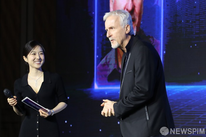 [서울=뉴스핌] 정일구 기자 = '아바타: 물의 길' 제임스 카메론 감독이 9일 오후 서울 종로구 포시즌스 호텔에서 열린 '2022 글로벌 혁신을 위한 미래대화' 특별 대담에 참석하고 있다. 왼쪽은 방송인 이혜성. 2022.12.09 mironj19@newspim.com