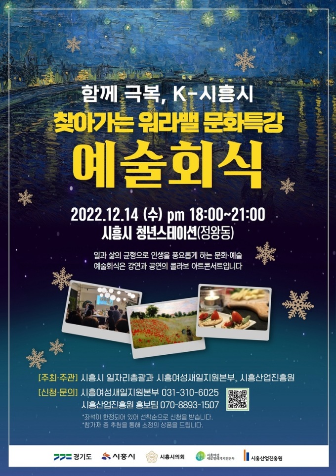 시에 따르면 시흥산업진흥원과 협업해 진행하는 이번 행사는 함께 만들어가는 대한민국 대표도시 'K-시흥시' 시정에 발맞춰 워라밸 문화특강 '인생음미(音美) 예술회식'을 개최해 산업단지에 활력을 불어넣고, 코로나19 및 산업 환경악화로 어려움을 겪는 기업인 및 근로자들이 함께 공감하고 즐길 수 있는 문화예술 공연을 선보이고자 마련됐다.