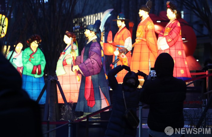 [서울=뉴스핌] 정일구 기자 = 19일 오후 서울 종로구 광화문광장 일대에서 열린 '2022 서울라이트 광화'와 '2022 서울 빛초롱' 행사를 찾은 시민들이 전시물을 관람하고 있다. 이날 개막한 '2022 서울라이트 광화'와 '2022 서울 빛초롱'은 오는 31일까지 13일간 진행되며, 매일 오후 6시부터 10시까지 관람할 수 있다. 2022.12.19 mironj19@newspim.com