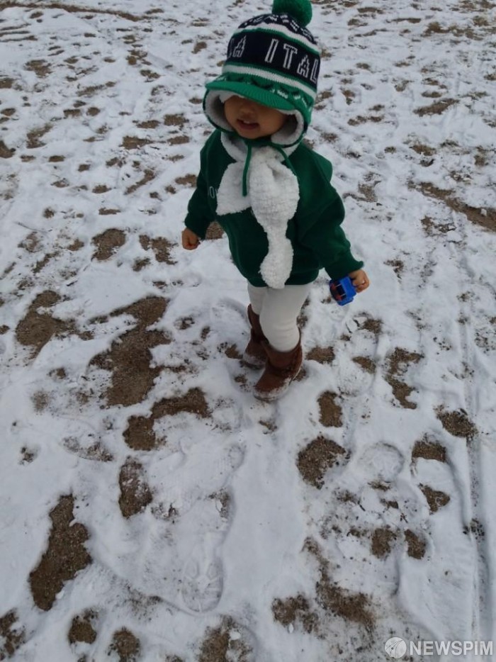 [광주=뉴스핌] 조은정 기자 = 광주와 전남 전역에 대설특보가 발효된 23일 광주 서구 치평동 상무시민공원에서 꼬마 아이가 쌓인 눈을 만지며 놀고 있다. 2022.12.23 ej7648@newspim.com