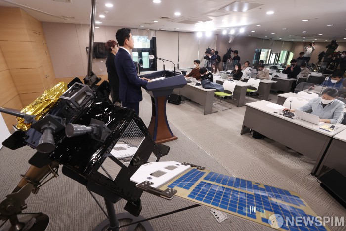 [서울=뉴스핌] 김학선 기자 = 오태석 과학기술정보통신부 1차관이 28일 정부서울청사에서 다누리 달궤도 진입 결과 브리핑을 하고 있다. 2022.12.28 yooksa@newspim.com