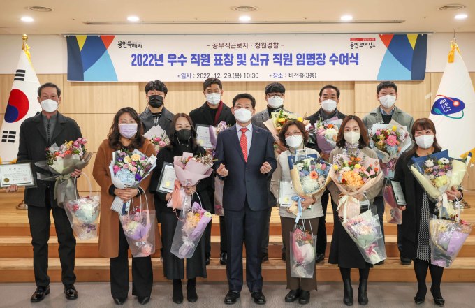 [용인=뉴스핌] 노호근 기자 = 이상일 용인특례시장은 29일 공무직근로자, 청원경찰 등 우수직원 11명에게 표창을 전달하고 신규 임용된 공무직근로자와 청원경찰 등 직원 42명에게 임명장을 수여했다.