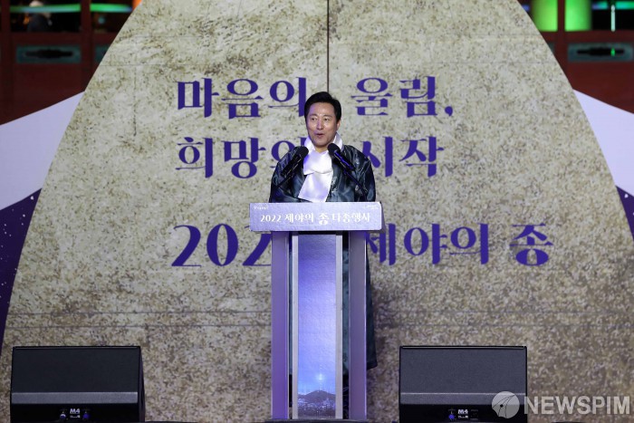 [서울=뉴스핌] 윤창빈 기자 = 2023년 계묘년을 맞은 1일 새벽 서울 종로구 보신각에서 오세훈 서울시장이 제야의 종 타종행사를 마치고 신년사하고 있다. 2023.01.01 pangbin@newspim.com