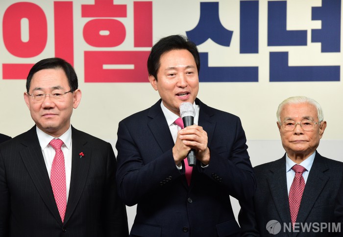 [서울=뉴스핌] 황준선 기자 = 오세훈 서울시장이 1일 서울 여의도 국민의힘 중앙당사에서 열린 2023 신년인사회에서 인사말을 하고 있다. 2023.01.01 hwang@newspim.com